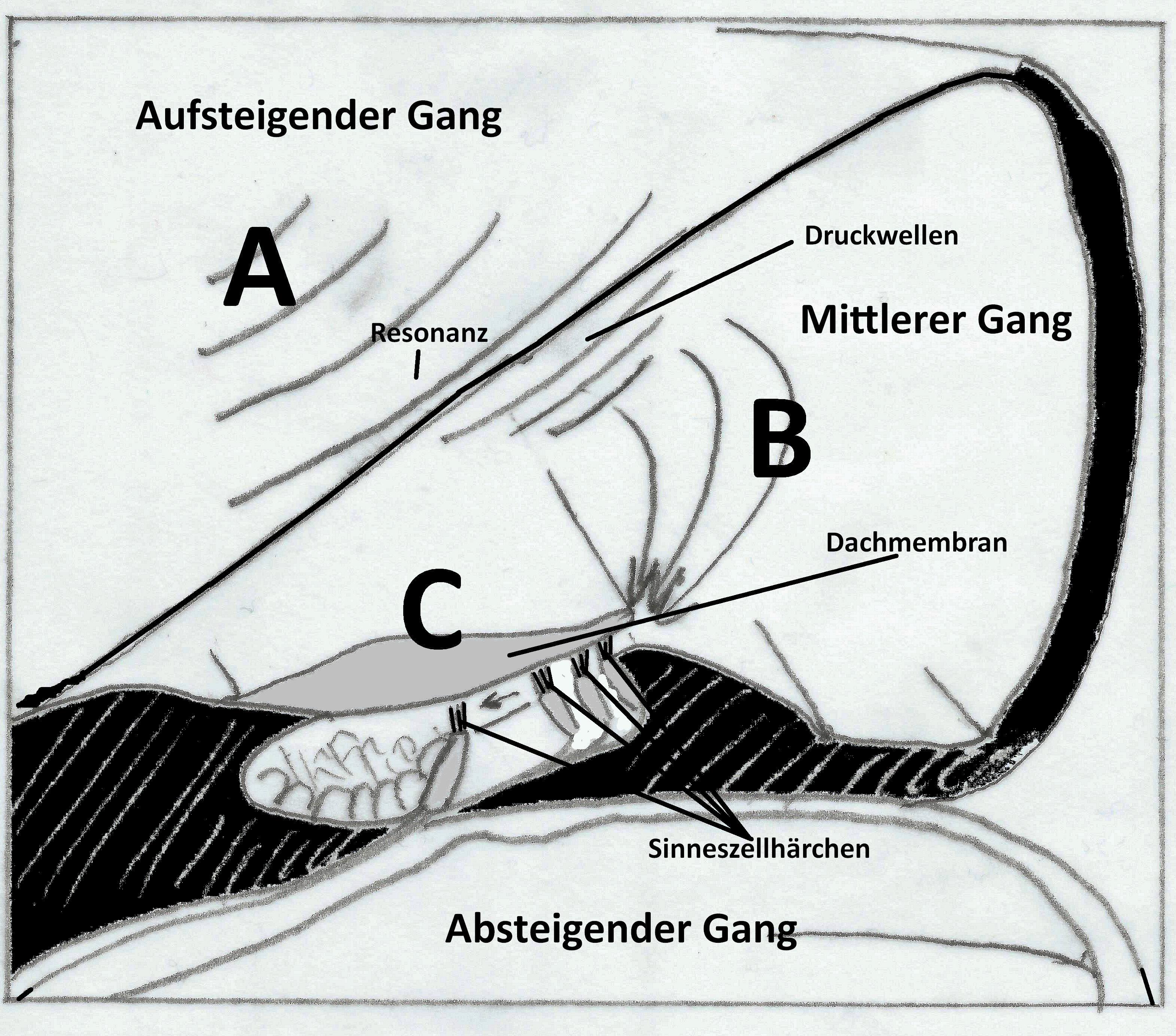 Über das ovale Fenster zum Mittelohr wird die Perilymphe der Scala vestibuli (aufsteigender Gang) in Schwingung versetzt und es bilden sich in ihr örtliche Resonanzfelder, A, die in Abhängigkeit zum örtlichen Volumen der Scala vestibuli stehen. Dies führt zu einer örtlichen Resonanzschwingung der extrem dünnen Reissnermembran, die diese Schwingung als Longitudinalwellen an die Endolymphe des Ductus cochlearis (mittlerer Gang) vermittelt, B, wo sie örtlich gebunden zwischen Basilarmembran und Membrana tectoria, C, hindurchlaufen und im Sulcus spiralus internus wieder abklingen.